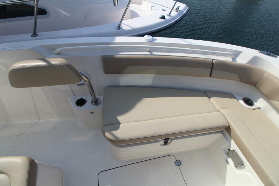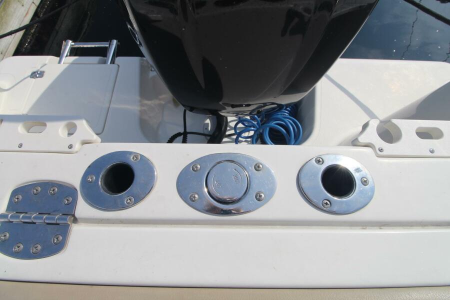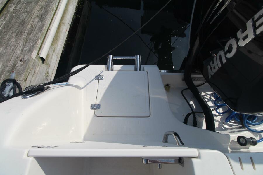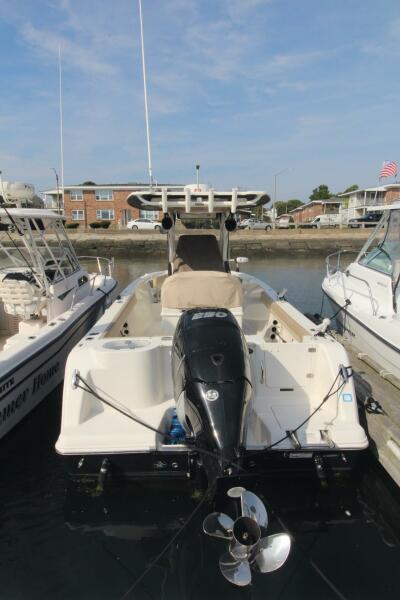 The 236CC is perfect inshore or offshore, with family friendly features such as a deep step-down head, comfortable deep bow seating, telescoping ski pole and the highest freeboard of any similar sized boat. Rod holders and cup holders abound, along with two 120 quart bow fish boxes, a 30 gallon built-in transom bait well, built-in 27 quart forward facing console seat cooler, large in-floor bow storage, handy console footrest locker and an optional console top organizer. The ergonomic console face keeps all controls in reach and was designed to accommodates today’s larger electronics. Innovative fold-up seating in aft means plenty of room in the cockpit and passenger comfort when underway. Powered by a single Mercury Verado 250 with approx 390 hours .