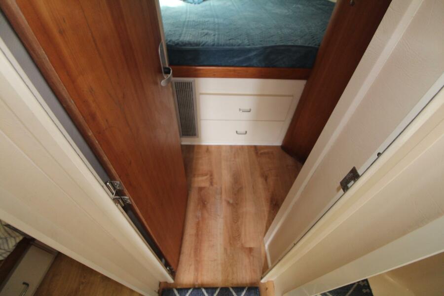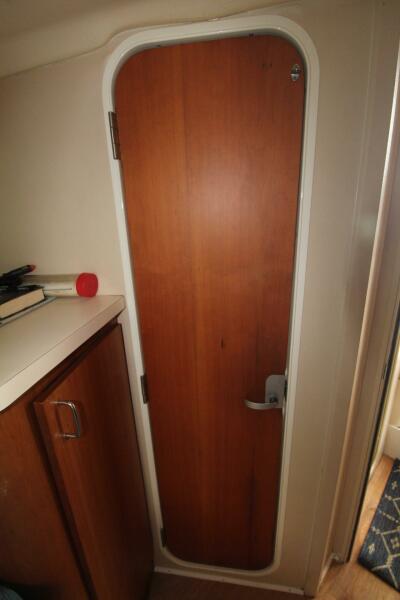 AS you enter the salon through a glass slider immediately to starboard is a large -shaped convertible settee; across to port is the galley with 110/12V refrigerator;2 burner stovetop and microwave oven; forward to starboard is the head with 2 separate entrances, one to the private forward cabin and the other to the companionway; the head is good size and features a vanity and toilet; across to port is the second stateroom with upper/lower bunks; the forward stateroom has a large semi-round queen berth, privacy door and private entrance to the head; interior is in excellent condition and very open and bright
